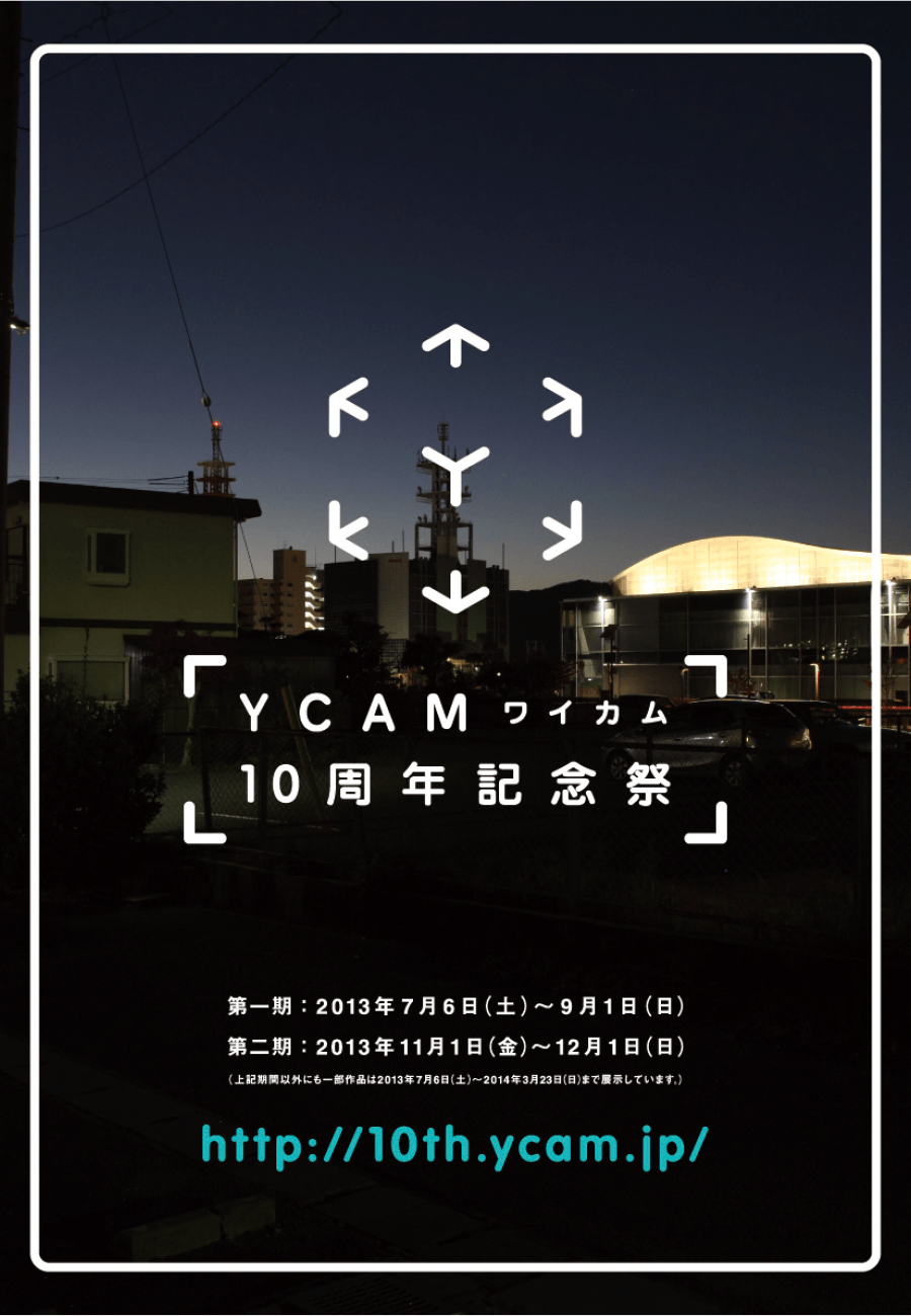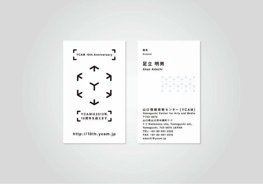 2013年、山口情報芸術センターの10周年に開催されたYCAM10周年記念祭。 Yを中心に矢印が6つ、想いが強ければ空間は広がり、いろんな想いと繋がっていくロゴです。 アーティスティックディレクターは坂本龍一さんです。 2014年ONESHOW DESIGNファイナリストに選出。
